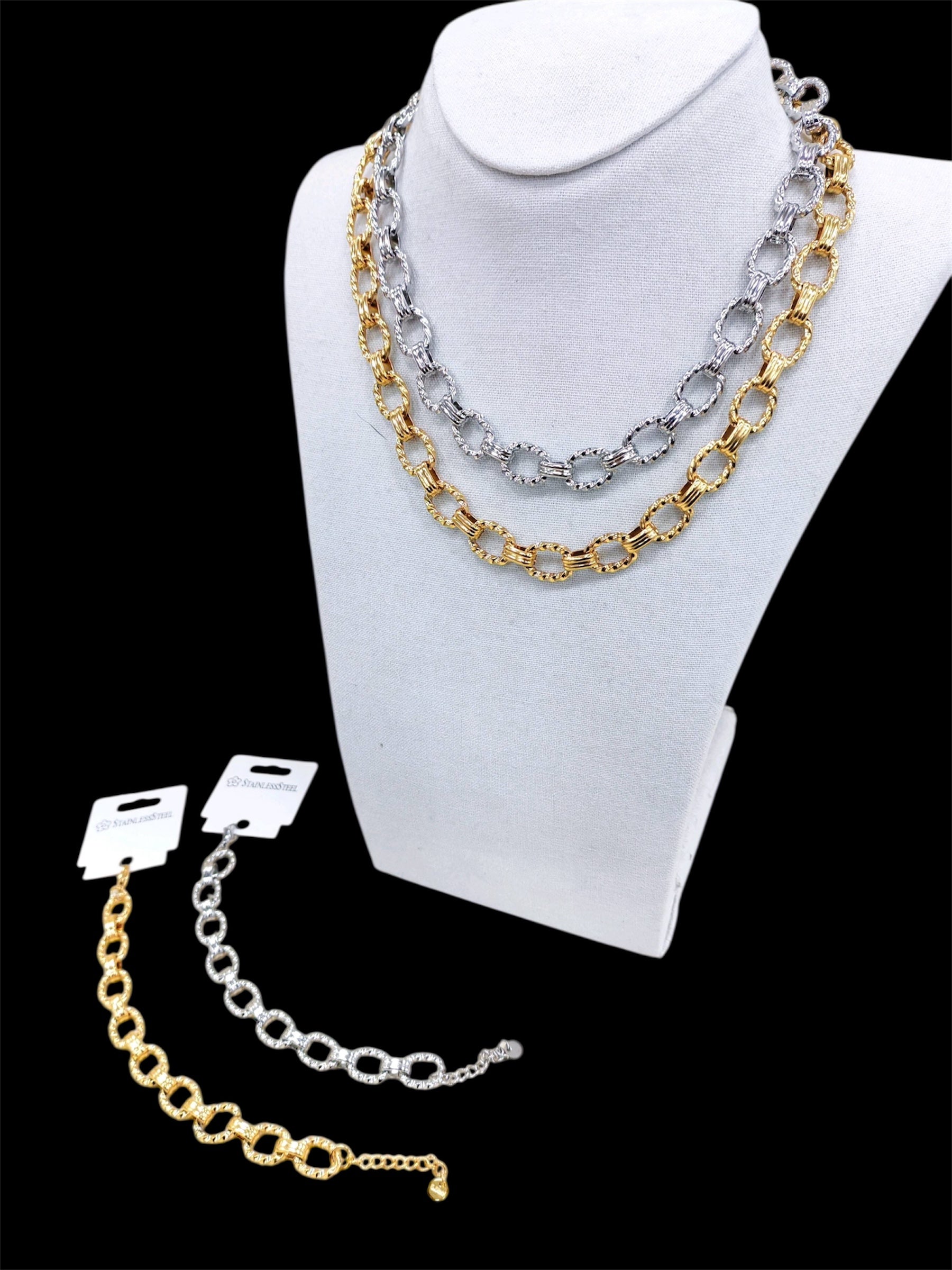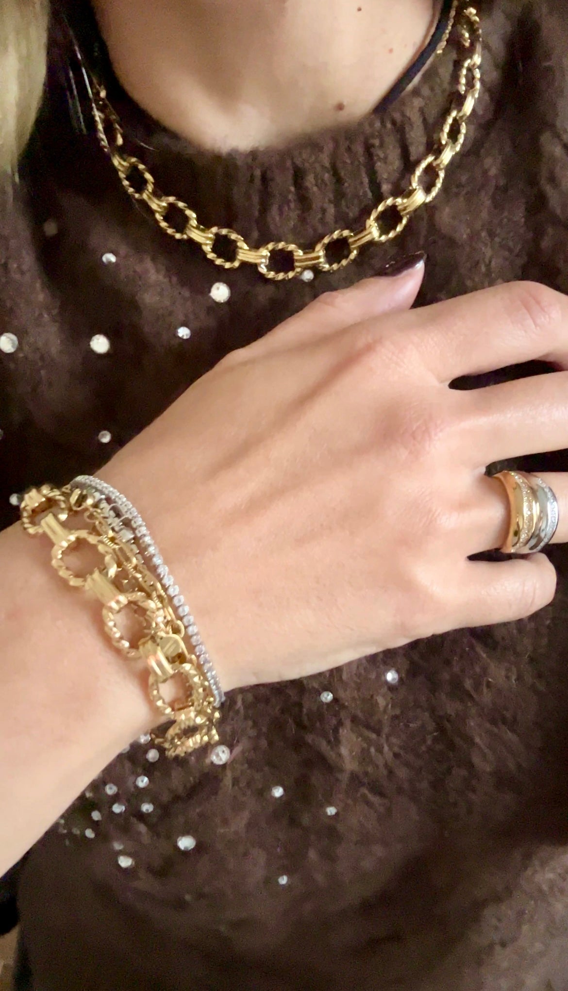 La bellezza e la versatilità del set Big Mama ti faranno impazzire. Con una collana a fit pazzesco, indossabile come choker o girocollo, e un bracciale regolabile, questo set è perfetto per ogni occasione. Aggiungi un tocco di tendenza al tuo look con il set Big Mama.
